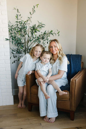 Bedtime just got even sweeter with our Light Blue Gingham Short Pajama Set. designed to match Mebie Baby Women's Light Blue Gingham pajama set for the cutest mommy and me moments! Featuring a charming light blue gingham print. this two piece set includes a short-sleeve button-up top and comfy elastic waist shorts. Made from ultra soft. breathable fabric. it keeps little ones cool and cozy all night long.