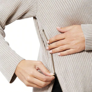 Thoughtfully designed for modern maternity life, this ribbed knit sweater blends sustainability with understated elegance. The bamboo–organic cotton blend feels exceptionally soft against sensitive skin, while the longline cut and side zip nursing access support you through pregnancy and beyond. Made for daily wear, it’s a timeless, eco-conscious essential that prioritizes comfort, function, and quiet confidence—before and after baby arrives.